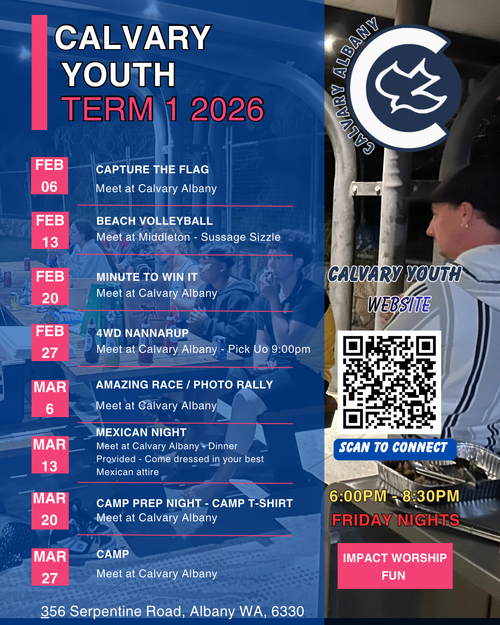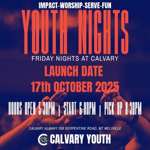 Calvary Youth is for Students from year 7 - 12. We meet every Friday night to Worship , Study Gods Word & have a heap of Fun! Calvary Youth is all about Jesus and our relationship with Him . We take Gods Word seriously and believe it can and will change young people lives. Young people are the church of today and at Calvary our aim is to embolden and encourage our young people to serve Jesus and take Him to the world !